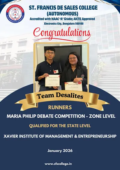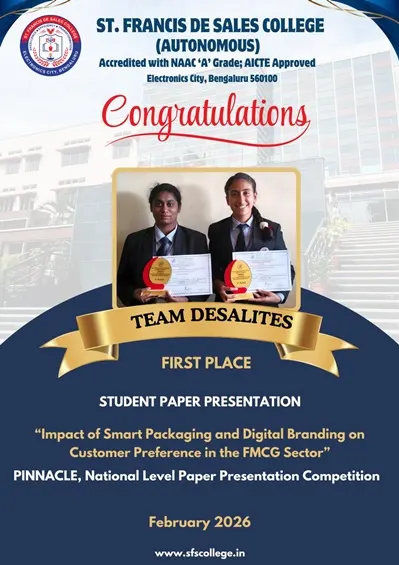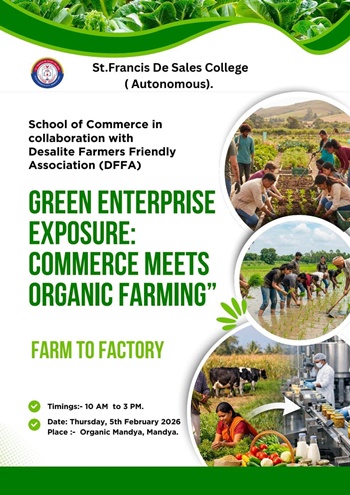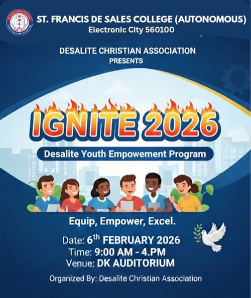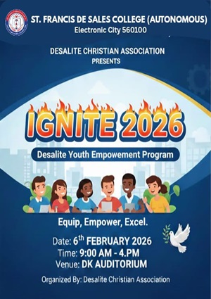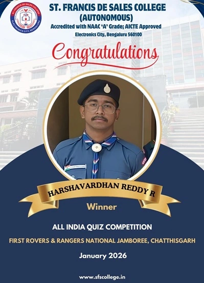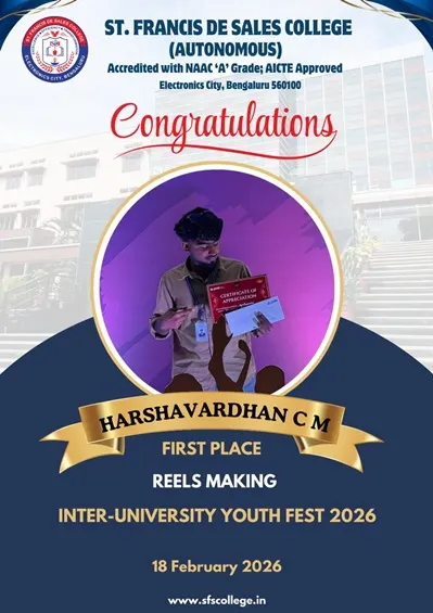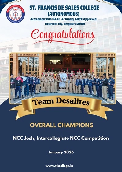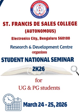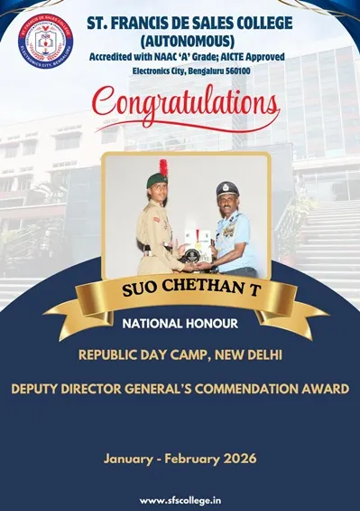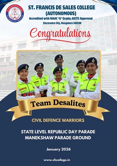 St. Francis de Sales College (Autonomous), popularly known as SFS College, is one of the leading Institutions of Higher Education in Bengaluru, Karnataka. Founded in 2004 with the vision of Excellence, Efficiency, and Transformation, the College is run by the Missionaries of St. Francis de Sales (MSFS) of the South West India Province, also known as Fransalians.
