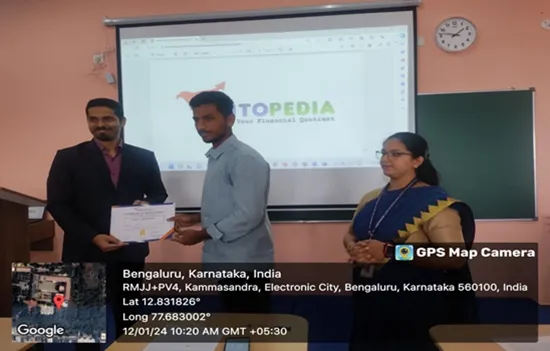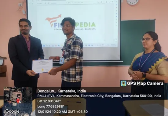 BAZAAR SHASTHRA is a workshop conducted for MBA and BBA students on 12/01/2024. The session had an esteemed resource person Mr Nachiket Save, Marketing Manager, Fintopedia. This was a 90 minute session conducted by FINTOPEDIA. The session started with welcoming the resource person and gathering. The first 15 minutes of the workshop was of interview screening wherein a recorded interview of financial market veteran was played. Next 25 minutes was on imparting knowledge on financial literacy to students so they have clear view of investment in stock market. After this competition registration by students took place. The students played a game for 30 minutes on stock market. The students were given chance to discover market scenarios. And finally top 3 students were given with certificates and participation certificates were given to all students.