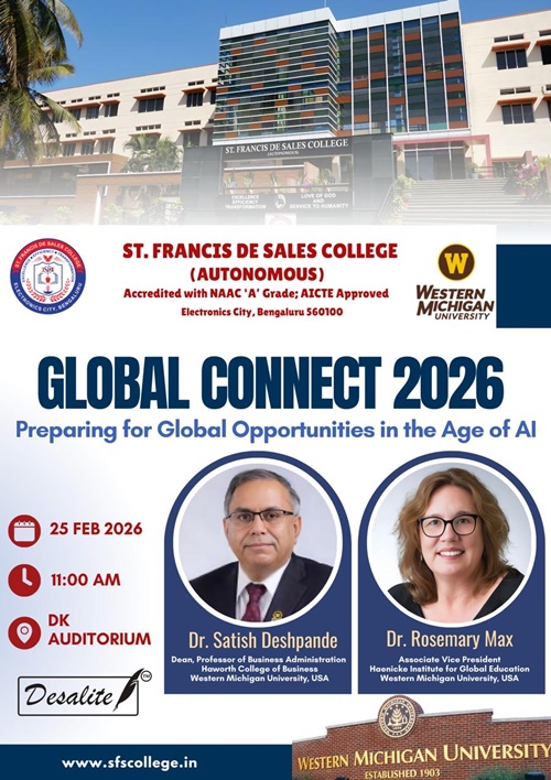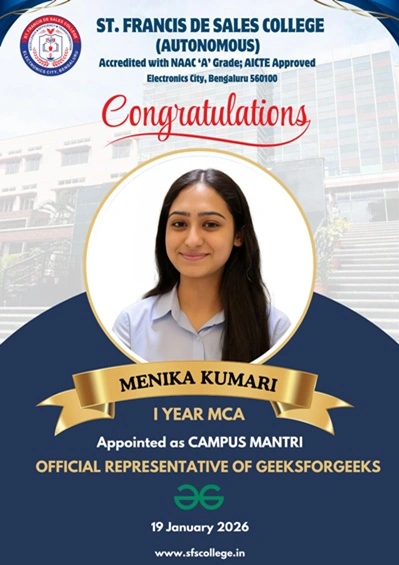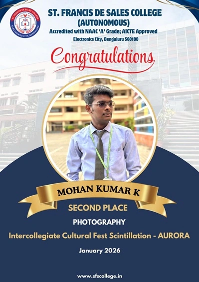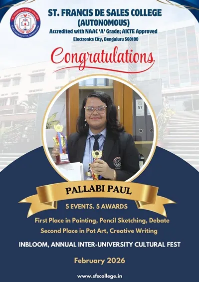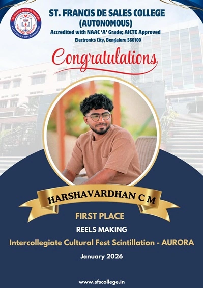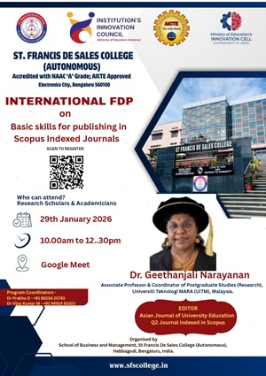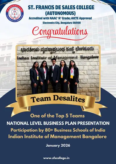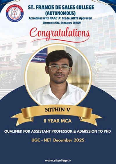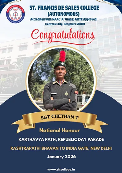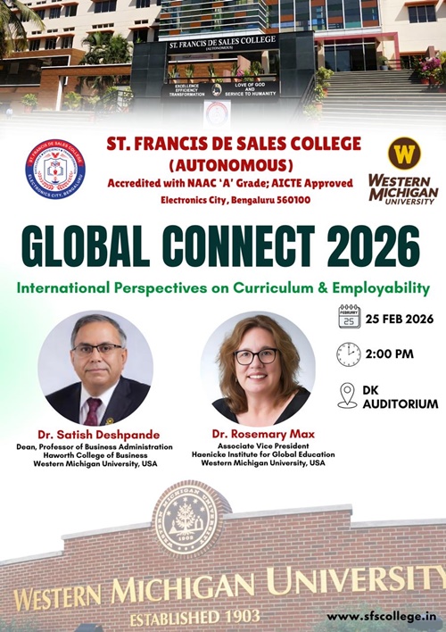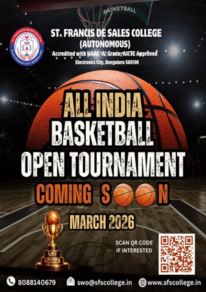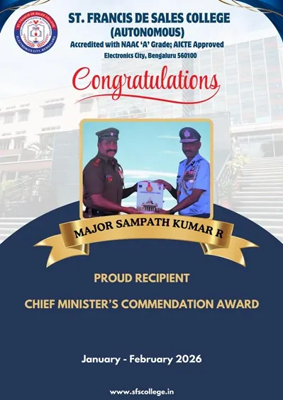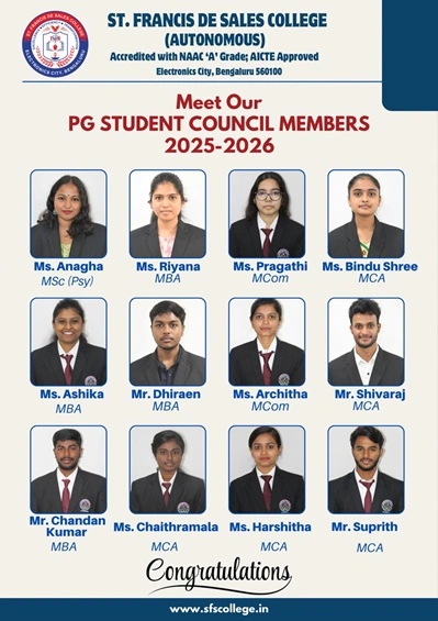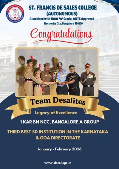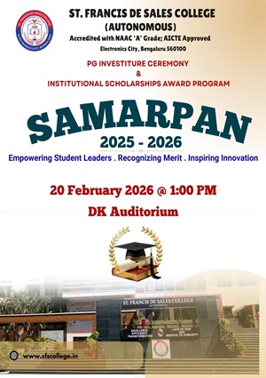 St. Francis de Sales College (Autonomous), popularly known as SFS College, is one of the leading Institutions of Higher Education in Bengaluru, Karnataka. Founded in 2004 with the vision of Excellence, Efficiency, and Transformation, the College is run by the Missionaries of St. Francis de Sales (MSFS) of the South West India Province, also known as Fransalians.